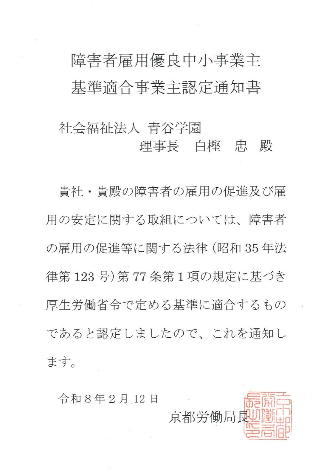 京都府で13番目、京都府内の社会福祉法人としては初認定となります。