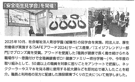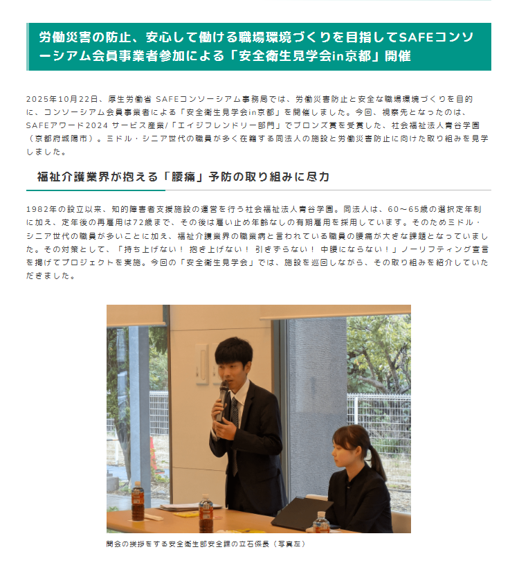 ミドル・シニア世代の職員が多い福祉介護の現場における、先進的な労働災害防止の取り組みが評価され、見学会の視察先として選ばれたものです。当日の様子や、当法人の取り組みが詳しく紹介されておりますので、ぜひご覧ください。